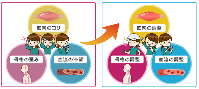 身体を構成する筋肉・骨格・関節・神経・血流の動きや働きが悪くなることで、痛み・しびれ・自律神経症状など不調をきたします。
